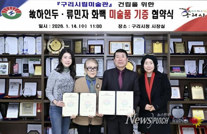 뉴스펀치 박상훈 기자 | 구리시는 지난 14일 시청 3층 시장실에서 ‘구리시립미술관 건립을 위한 작품 기증 협약식’을 개최했다. 이번 협약식은 한국 현대미술사의 거장 고(故) 하인두 화백의 작품 80점과 류민자 화백의 작품 25점을 기증받고, 문화예술 교류 협력을 공식화하기 위해 마련됐다.