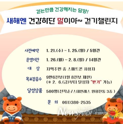 뉴스펀치 김용희 기자 | 담양군은 2026년 새해를 맞아 오는 1월 26일부터 2월 8일까지 온라인 걷기 챌린지 ‘새해엔 건강하단 말이야’를 운영한다고 밝혔다.