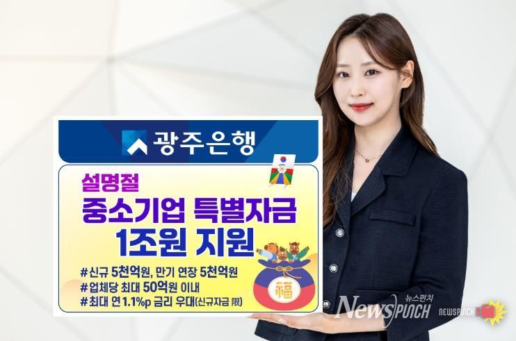 뉴스펀치 김용희 기자 | 광주은행은 설 명절을 앞두고 자금 운용에 어려움을 겪는 지역 중소기업 및 소상공인을 위해, 1월 15일부터 2월 27일까지 총 1조 원 규모의 ‘2026년 설 명절 중소기업 특별자금’을 지원한다고 밝혔다.