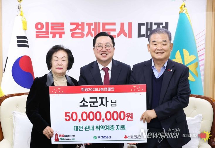 뉴스펀치 이현승 기자 | 대전시는 15일 오전 시청 10층 응접실에서 아너소사이어티 회원인 소군자 기부자(124호)로부터 대전사회복지공동모금회를 통해 관내 취약계층 지원을 위한 성금 5천만 원을 전달받았다.