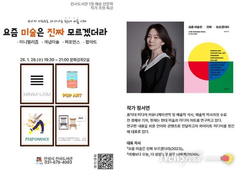 뉴스펀치 박상훈 기자 | 안성시 진사도서관은 오는 1월 28일, 『요즘 미술은 진짜 모르겠더라』의 저자 정서연 작가를 초청해 ‘현대미술’을 주제로 한 강연을 진행한다.