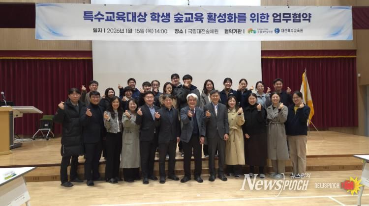 뉴스펀치 이현승 기자 | 대전특수교육원은 1월 15일 국립대전숲체원 강당에서 국립대전숲체원과 ‘특수교육대상학생 숲 교육 활성화’를 위한 업무협약을 체결했다고 밝혔다.
