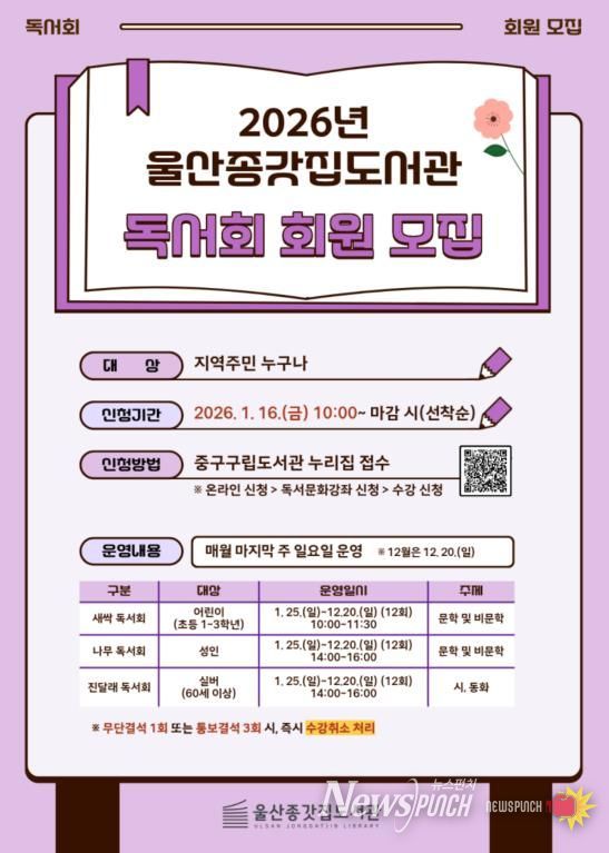 뉴스펀치 김윤걸 기자 | 울산 중구에서 운영하는 울산종갓집도서관이 2026년 독서회 회원을 모집한다.