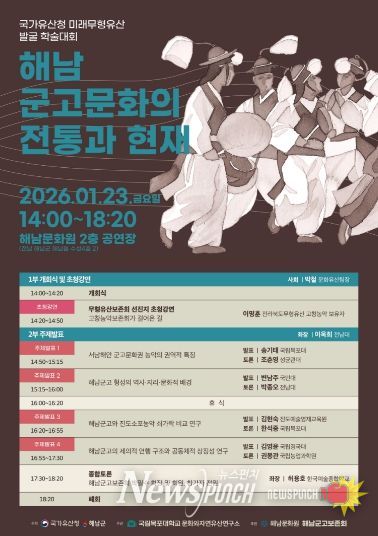 뉴스펀치 김용희 기자 | 해남군은 오는 23일 해남문화원 2층 공연장에서‘해남 군고문화의 전통과 현재’를 주제로 한 학술대회를 개최한다.