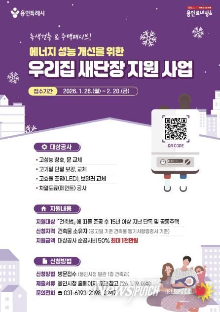 뉴스펀치 박상훈 기자 | 용인특례시가 오는 26일부터 2월 20일까지 노후주택 에너지 효율 개선 지원 사업인 ‘우리집 새단장 지원사업’ 신청을 받는다고 16일 밝혔다.