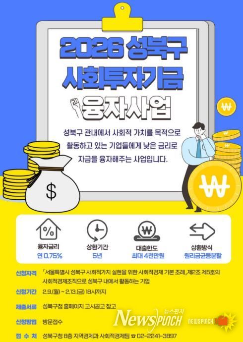 뉴스펀치 박상훈 기자 | 서울 성북구가 ‘2026년 상반기 사회투자기금 융자 지원 사업’을 실시한다. 경제적 어려움을 겪는 관내 사회적경제 조직의 안정적인 운영을 돕기 위해서다.