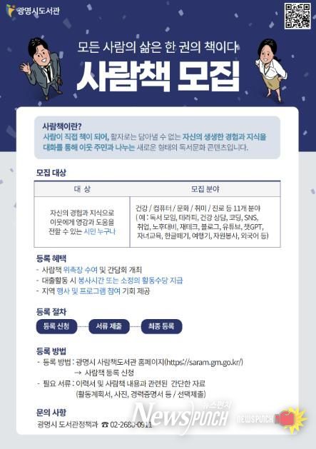 사람책으로 활동을 희망하는 시민은 광명시 사람책도서관 누리집의 ‘사람책 등록’ 게시판에서 신청하면 되며, 이웃을 추천하고 싶은 시민은 누리집 내 ‘커뮤니티–질문과 답변’ 게시판을 통해 참여할 수 있다.