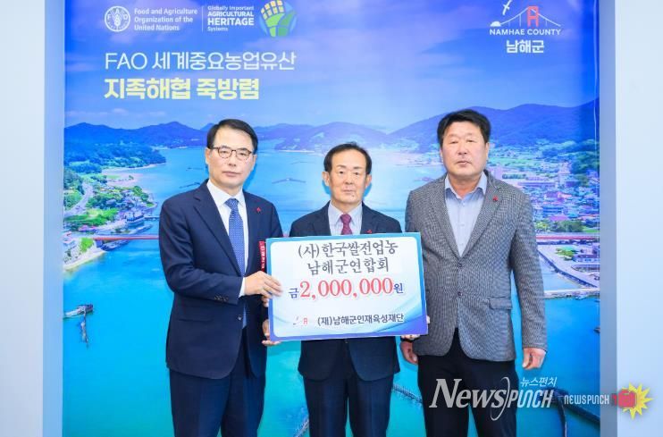 뉴스펀치 박세훈 기자 | (재)남해군인재육성재단은 이철세 서면노인회 분회장, 중현떡집, 금송운수, (사)한국쌀전업농남해군연합회에서 인재육성기금을 기탁했다고 밝혔다.