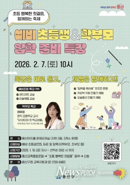 뉴스펀치 박상훈 기자 | 서울 용산구는 오는 2월 7일 용산아트홀(녹사평대로 150)에서 예비 초등학생과 학부모를 위한 입학 준비 행사인 ‘초등 행복한 첫걸음, 함께하는 축제’를 개최한다.