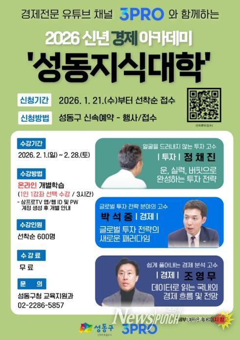 뉴스펀치 박상훈 기자 | 서울 성동구는 새해를 맞아 투자, 경제 분야 전문 온라인 강좌를 무료로 들을 수 있는 신년 경제 아카데미 ‘성동지식대학’을 운영한다고 밝혔다.