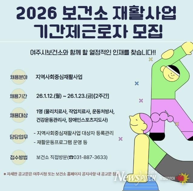 뉴스펀치 박상훈 기자 | 여주시보건소는 지역 내 등록장애인과 예비장애인들의 건강관리를 위한 지역사회중심재활사업 추진을 위해 1월 12일부터 1월 23일까지 2주간 기간제근로자 채용 공고를 실시한다.