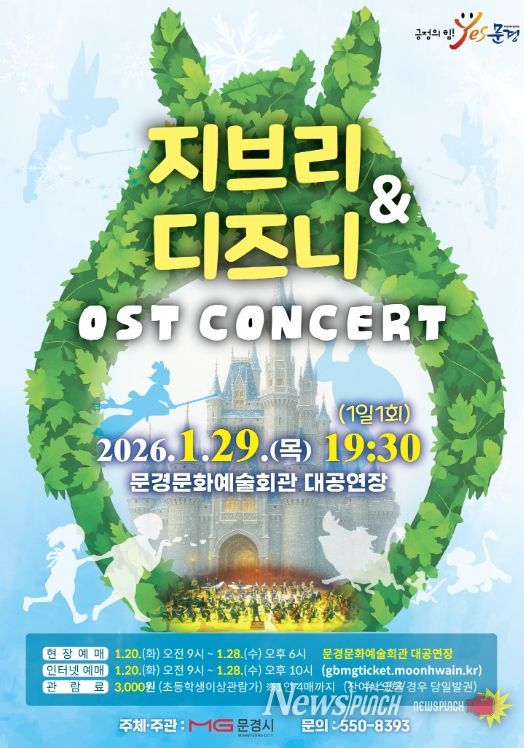 뉴스펀치 박세훈 기자 | 문경문화예술회관에서는 신년 겨울 방학을 맞아 인기 애니메이션 대표곡들을 들려주는 지브리 ·디즈니 OST 콘서트 공연을 1월 29일 19:30 (1일 1회)에 문경문화예술회관 대공연장에서 개최한다.