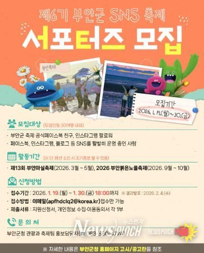 뉴스펀치 정홍균 기자 | 부안군은 오는 19일부터 30일까지 부안의 대표 축제를 홍보할 제6기 부안군 SNS 축제 서포터즈’를 모집한다.