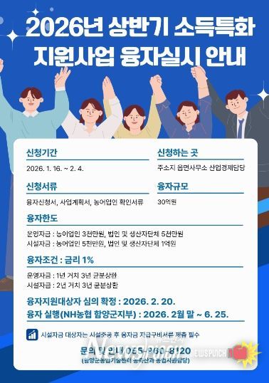 뉴스펀치 박세훈 기자 | 함양군은 농업인의 경영개선과 농업 경쟁력 강화를 위한 ‘2026년 상반기 소득특화지원사업’을 시행하고, 오는 2월 4일까지 융자신청을 받는다.