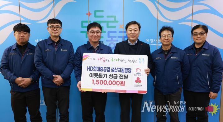 뉴스펀치 김윤걸 기자 | HD현대중공업 생산지원담당(부서장 박필용 수석)은 1월 16일 오전 10시 동구청을 방문해 이웃돕기 성금 150만 원을 전달했다.