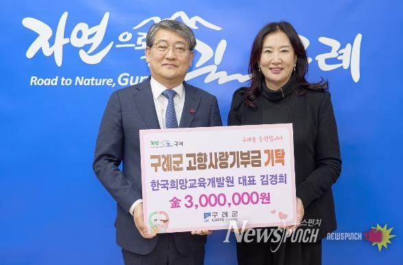 뉴스펀치 김용희 기자 | 구례군은 지난 15일 한국희망교육개발원 김경희 대표가 고향사랑기부금 300만원을 구례군에 기탁했다고 밝혔다.
