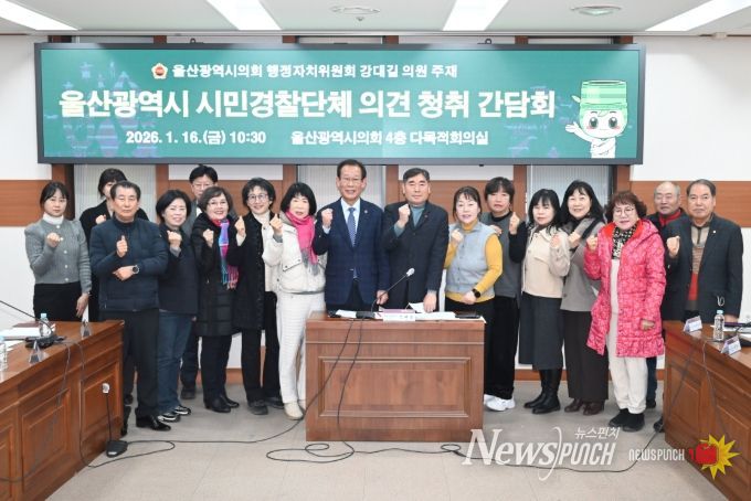 뉴스펀치 김윤걸 기자 | 울산시의회 강대길 의원은 16일 의회 4층 다목적회의실에서 주민, 시민경찰단체, 경찰위원회ㆍ경찰청 관계 부서 등과 함께 ‘울산광역시 시민경찰단체 의견 청취’ 간담회를 개최했다.