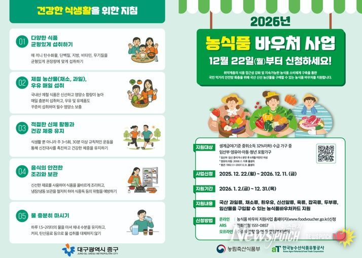 뉴스펀치 조평훈 기자 | 대구 중구는 취약계층의 식품 접근성을 높이고 건강한 식생활을 지원하기 위해 ‘2026년 농식품바우처 지원사업’을 확대 시행한다.