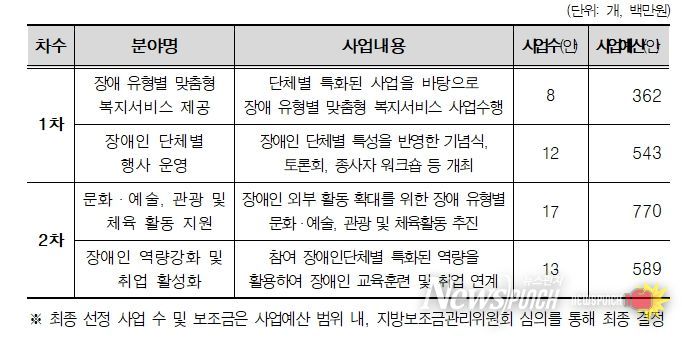 지원사업 1차 공모는 오는 23일(금) 18시까지로 ▴장애 유형별 맞춤형 복지서비스 제공 ▴장애인 단체별 행사 운영 분야를 대상으로 진행되며 결과는 2월 중 발표할 예정이다. 2차 공모 접수는 2월 10일부터 2월 20일 18시까지이며 ▴문화·예술·관광·체육활동 ▴장애인 역량 강화 및 취업 활성화 분야이다.