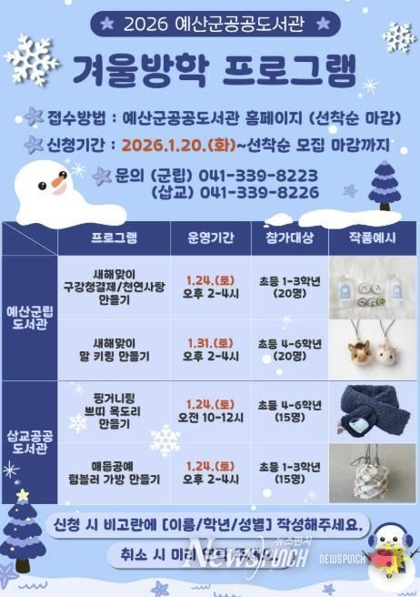 뉴스펀치 이현승 기자 | 예산군은 겨울방학을 맞아 관내 초등학생을 대상으로 오는 1월 24일과 31일 토요일 이틀간 공공도서관 겨울방학 프로그램을 운영한다.