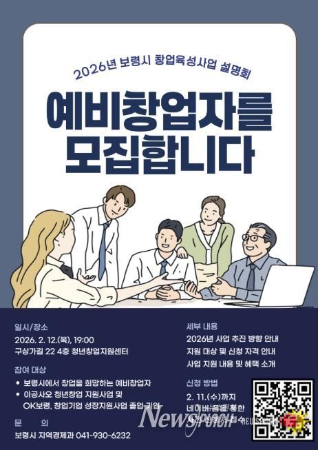 뉴스펀치 이현승 기자 | 보령시는 오는 2월 12일 오후 7시 청년창업지원센터에서 예비창업자 및 창업기업을 대상으로 ‘2026년 창업육성사업 설명회’를 개최한다.