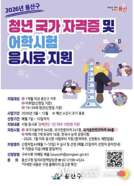 뉴스펀치 박상훈 기자 | 서울 용산구가 올해 ‘청년 국가자격증 및 어학시험 응시료 지원 사업’ 예산과 지원 종목을 대폭 확대해 시행한다. 기존 대비 지원대상을 100여 명 늘리고, 국가공인민간자격 99종을 새롭게 추가했다.