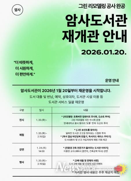 김영호 강동문화재단 대표이사는 “긴 휴관 기간을 믿고 기다려준 주민들에게 진심으로 감사드린다”며 “새롭게 단장한 암사도서관이 친환경적인 공간 속에서 지식과 휴식을 얻는 지역사회의 거점이 될 수 있도록 운영에 최선을 다하겠다”고 말했다.