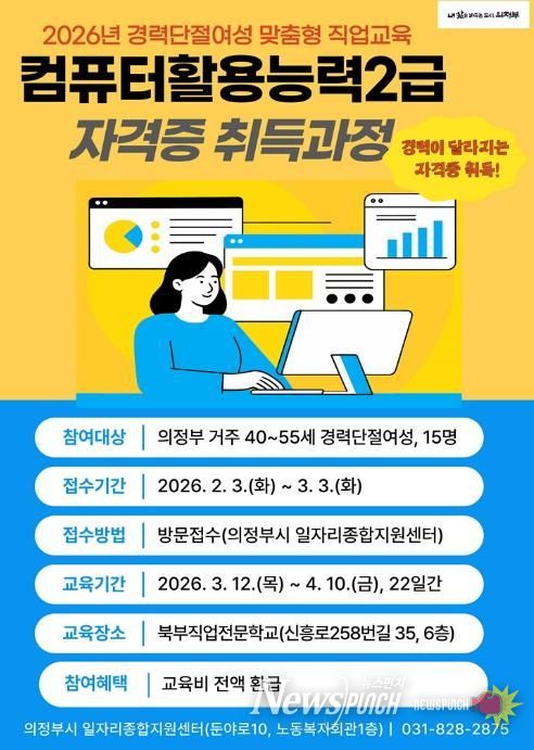 뉴스펀치 박상훈 기자 | 의정부시는 경력단절여성의 취업역량 강화를 위해 2월 3일부터 3월 3일까지 ‘컴퓨터활용능력2급 자격증 취득과정’ 참여자를 모집한다.