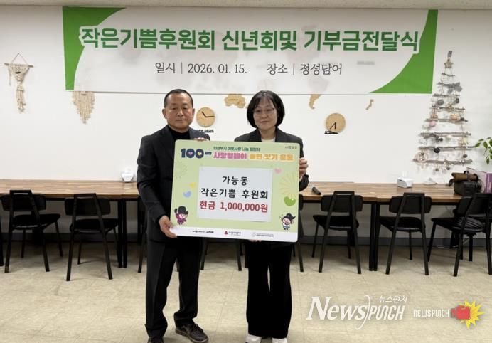 뉴스펀치 박상훈 기자 | 의정부시 가능동주민센터는 1월 15일 작은기쁨후원회가 ‘100일간 사랑릴레이 배턴 잇기’에 동참하며 성금 100만 원을 기탁했다고 밝혔다.