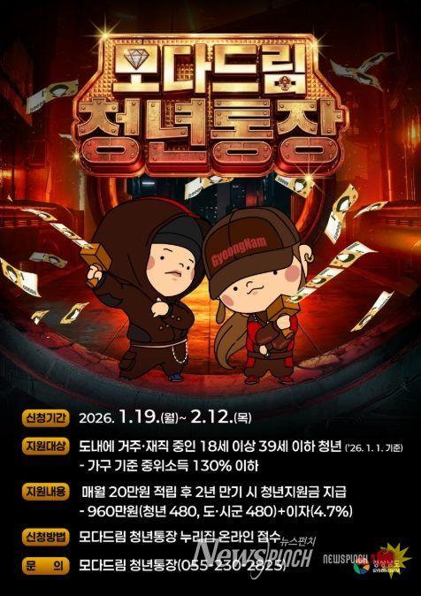 뉴스펀치 박세훈 기자 | 경상남도와 경남투자경제진흥원은 청년의 자산 형성과 지역 정착을 돕는 ‘모다드림 청년통장’ 상반기 참여자를 1월 19일부터 2월 12일까지 모집한다고 밝혔다.