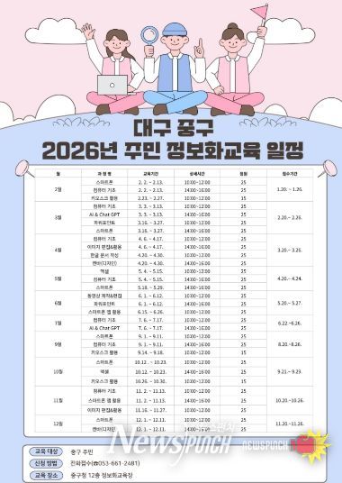 교육 신청은 중구 주민이면 누구나 가능하며, 매달 20일(휴일인 경우 다음날 평일) 오전 9시부터 전화 접수를 통해 선착순으로 모집한다. 세부 교육 일정과 과정별 운영 내용은 중구청 누리집(홈페이지)에서 ‘정보화교육’을 검색하면 확인할 수 있다.