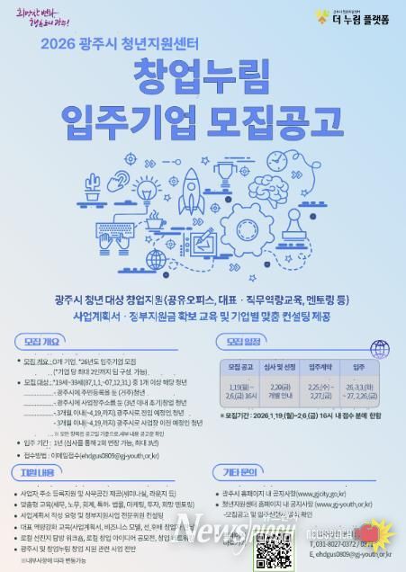 뉴스펀치 박상훈 기자 | 광주시는 지역 내 유망한 청년 창업가를 발굴하고 안정적인 창업 환경을 조성하기 위해 ‘2026년도 창업누림 신규 입주기업’을 공개 모집한다고 19일 밝혔다.