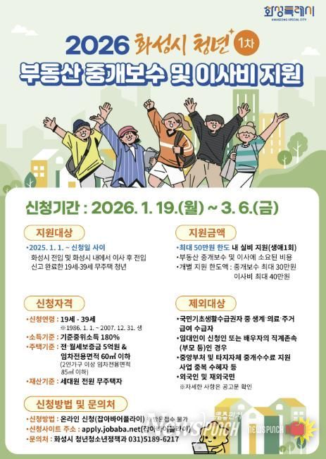 뉴스펀치 박상훈 기자 | 화성특례시가 19일부터 3월 6일까지 청년들의 주거비 부담 경감 및 정주 여건 향상을 위한 ‘2026년 상반기 청년 부동산 중개보수 및 이사비 지원사업’ 신청을 받는다.
