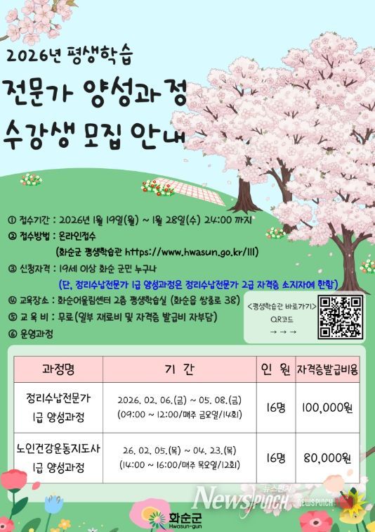 뉴스펀치 김용희 기자 | 화순군은 1월 19일부터 1월 28일까지 ‘2026년 상반기 평생학습 전문가 양성과정’ 수강생을 모집한다고 밝혔다.