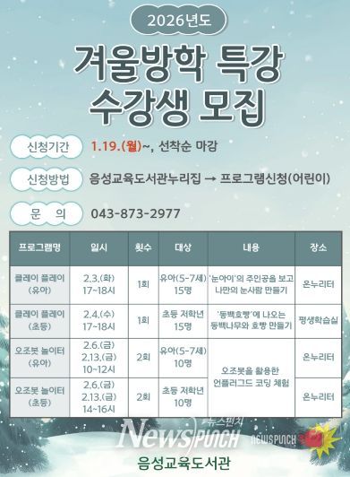 뉴스펀치 이현승 기자 | 음성교육도서관(관장 백경미)은 겨울방학을 맞아 유아와 초등학생 저학년을 대상으로 다양한 창의적 체험과 학습 활동을 제공하는 겨울방학 특강을 운영한다고 밝혔다.