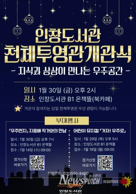 또한 1월 29일 오후 5시에는 우주인이 되기 위한 훈련 과정을 그린 우주과학 뮤지컬 ‘가자! 우주로’가 운영돼, 어린이들에게 우주에 대한 호기심과 상상력을 키워줄 것으로 기대된다. 행사와 관련한 자세한 사항은 인창도서관 홈페이지를 참고하거나 도서관정책팀으로 문의하면 된다.