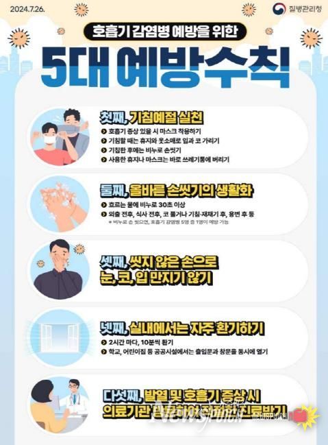 호흡기 감염병의 발생과 전파 예방을 위해서는 △ 접종 시기에 맞춰 예방접종 실시 △ 흐르는 물에 30초 이상 올바른 손씻기 △ 기침할 때 옷소매로 입과 코 가리기 △ 실내에서 자주 환기하기 △ 증상 발생 시 의료기관 방문해 진료받기 등 예방수칙을 준수하는 것이 중요하다.
