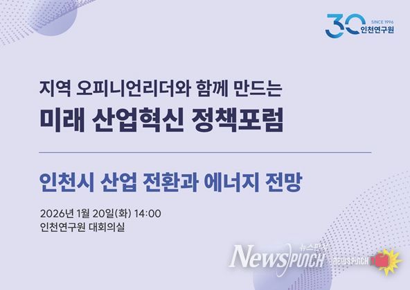 뉴스펀치 정홍균 기자 | 인천연구원은 2026년 1월 20일 오후 2시, 연구원 대회의실에서 '2026년 제1차 인천 미래 산업혁신 정책포럼'을 개최한다.