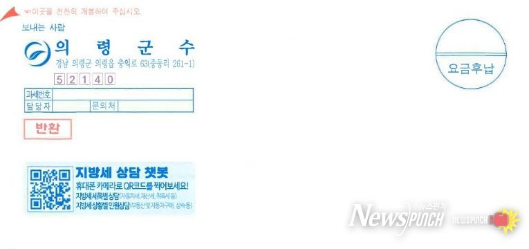 뉴스펀치 박세훈 기자 | 의령군은 지방세 고지서 전면에 ‘지방세 챗봇 상담서비스’ QR코드를 삽입해 발송한다고 밝혔다.