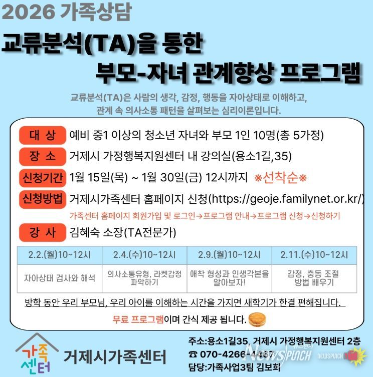 뉴스펀치 박세훈 기자 | 거제시가족센터는 오는 2일부터 진행하는'교류분석(TA)을 통한 부모–자녀 집단상담 프로그램' 참여자를 모집한다고 밝혔다.