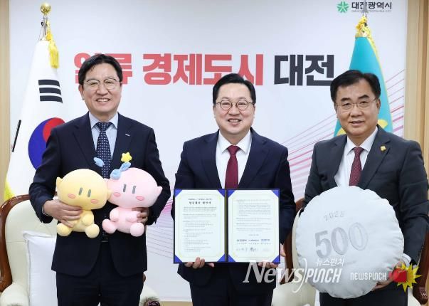 뉴스펀치 이현승 기자 | 대전시는 19일 시청 10층 응접실에서 대전관광공사, 한국조폐공사와 함께 ‘꿈씨패밀리 화폐 굿즈’ 출시를 위한 공동브랜딩 업무협약을 체결했다.