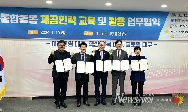 뉴스펀치 조평훈 기자 | 대구광역시는 1월 19일 오후 2시, 동인청사 2층 상황실에서 영남이공대학교, 대구시니어클럽협회, 대구지역자활센터협회, 대구사회복지관협회와 함께 ‘대구광역시 통합돌봄 서비스 제공인력 교육 및 활용에 관한 업무협약(MOU)’을 체결한다.