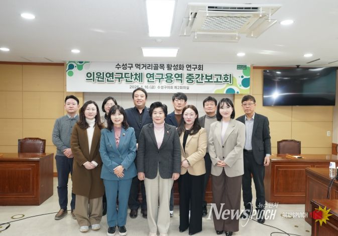 뉴스펀치 조평훈 기자 | 수성구의회 의원연구단체인 ‘수성구 먹거리골목 활성화 연구회(회장 정대현 의원, 남정호ㆍ김중군ㆍ김재현ㆍ정경은ㆍ최명숙 의원)’는 지난 16일 의회 2층 회의실에서 '수성구 먹거리골목 활성화 모델 마련' 연구용역 중간보고회를 개최했다.
