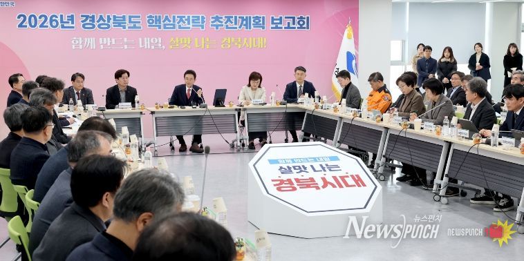 경상북도는 19일 동해안 현장(동부청사)에서 전 실국과 공공기관이 모두 참석한 가운데 ‘2026년 도정 핵심 전략 추진계획 보고회’를 열고 민생경제 살리기 특별대책, 5대 도정 방향과 중앙부처 업무 계획에 대응한 분야별 핵심 정책과제를 집중 점검했다.