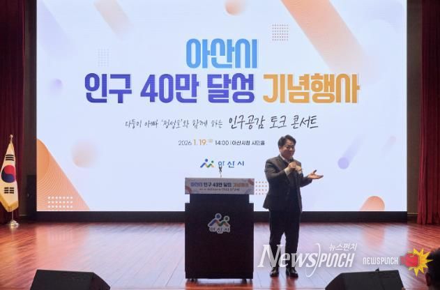 뉴스펀치 이현승 기자 | 아산시는 지난 19일 아산시청 시민홀에서 인구 40만을 넘어 50만 자족도시로 나아가기 위한 '아산시 인구 40만 달성 기념행사'를 성황리에 마쳤다.