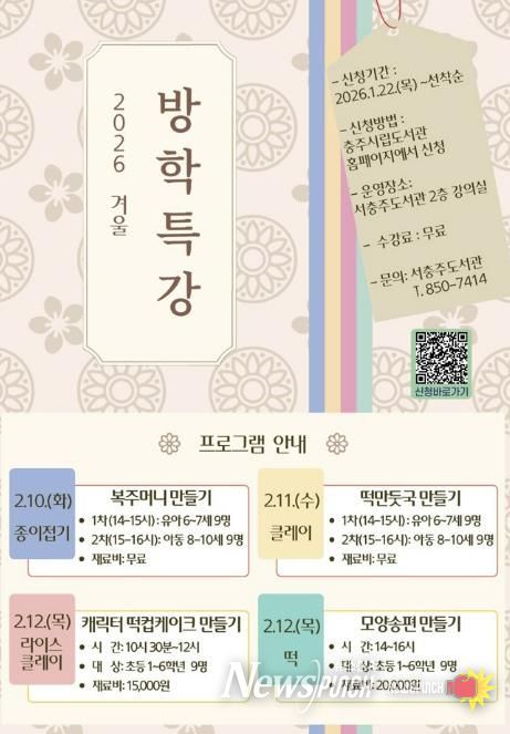 모집 인원은 유아 및 어린이 54명이며, 프로그램은 2월 10일부터 12일까지 3일간 서충주도서관 2층 강의실에서 진행된다.