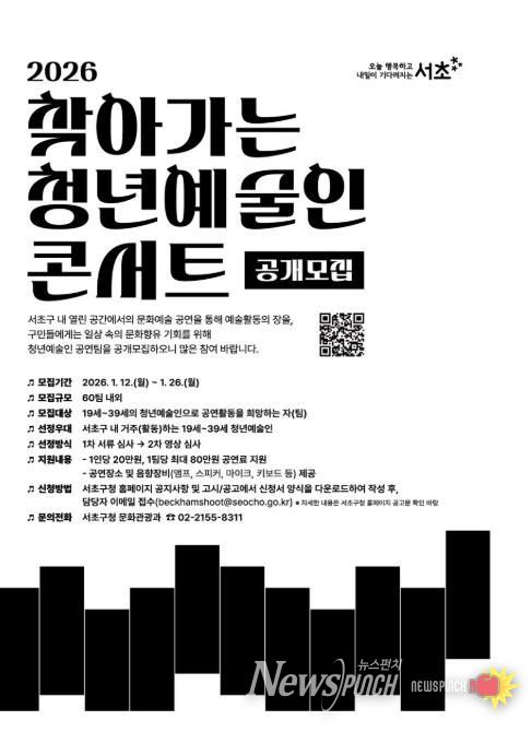 뉴스펀치 박상훈 기자 | 서울 서초구는 지역 내 일상 공간에서 자유롭게 끼와 역량을 펼칠 청년예술인 모집에 나선다고 밝혔다. 모집사업은 ‘찾아가는 청년예술인 콘서트’와 ‘서초 청년갤러리 사업’으로 각각 1월 26일(월), 2월 19일(목)까지 신청을 받는다.