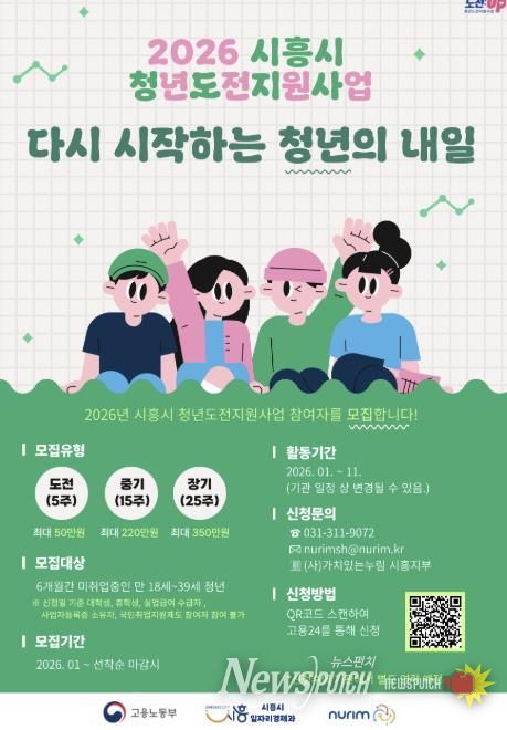 뉴스펀치 박상훈 기자 | 시흥시는 취업과 사회 진출에 어려움을 겪고 있는 청년들의 재도전을 지원하기 위해 ‘2026년 청년도전지원사업’ 참여자 156명을 모집한다.