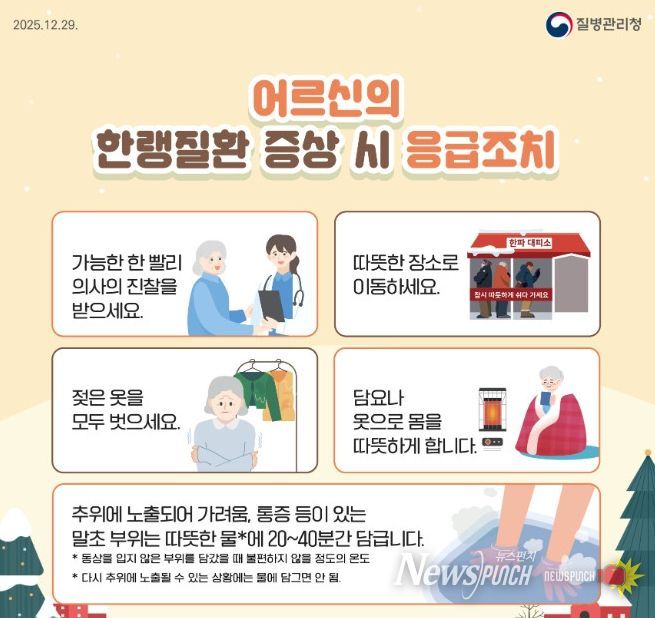 특히 겨울철 어르신들의 한랭질환 예방을 위해 ▲추운 날씨에는 야외활동 자제▲장갑, 목도리, 모자, 마스크 등 방한용품 착용으로 체온 유지 ▲실내 적정 온도 유지 및 습도 관리▲가벼운 실내운동으로 신체활동 유지▲적절한 수분 섭취와 균형 있는 영양 섭취 등의 건강수칙을 집중 안내하고 있다.