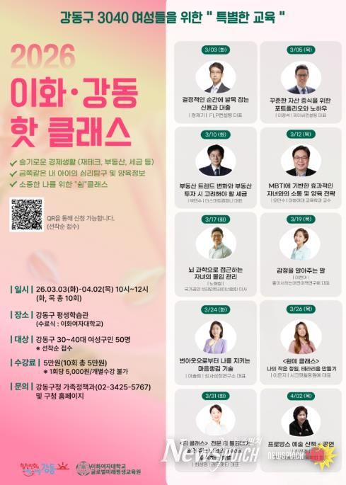 뉴스펀치 박상훈 기자 | 서울 강동구는 강동의 대표적인 여성 평생교육 프로그램인 '이화-강동 핫 클래스' 제2기 수강생을 1월 19일부터 선착순 모집 중이라고 밝혔다.